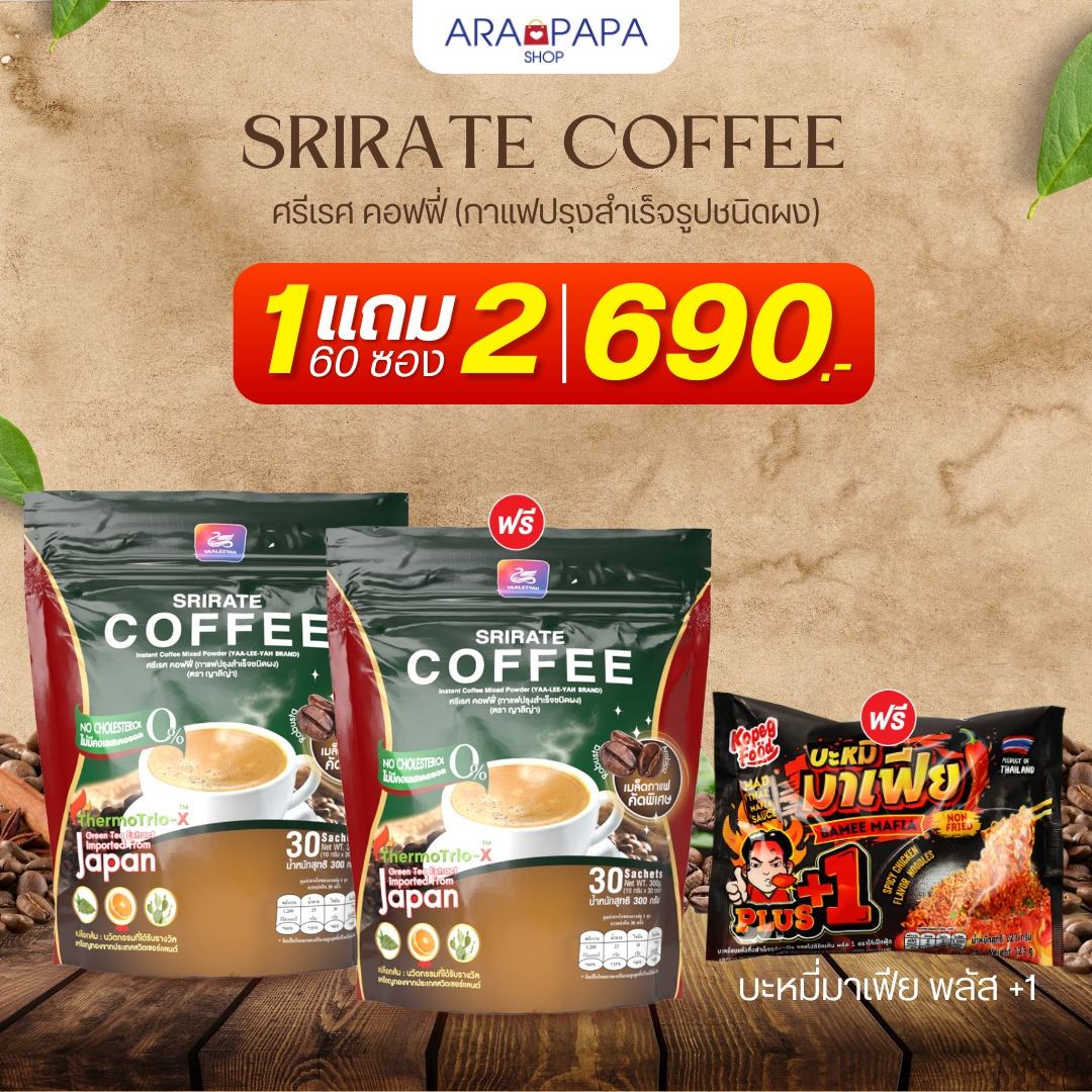 Srirate coffee กาแฟศรีเรศ กาแฟพี่ธัญญ่า หอมอร่อย โปรโมชั่น 1 แถม 2 (แถมกาแฟ1ห่อ+บะหมี่มาเฟีย1ซอง) 690.-Srirate coffee กาแฟศรีเรศ กาแฟพี่ธัญญ่า หอมอร่อย โปรโมชั่น 1 แถม 2 (แถมกาแฟ1ห่อ+บะหมี่มาเฟีย1ซอง) 690.-